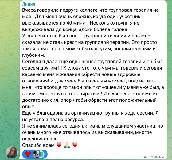 Я работаю в интегративном подходе. В диалоговом методе. Редко даю задания и упражнения. Для меня терапия — это про создания пространства для создания исцеляющих отношений. В котором человек может себя проявлять и быть принятым.
